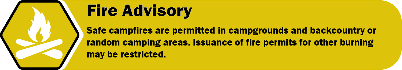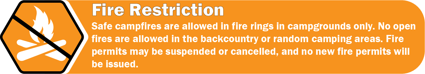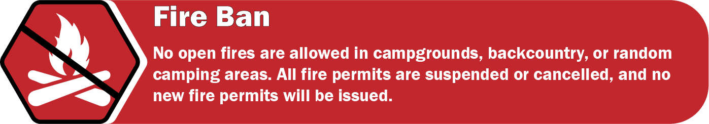No campfires (or other open fires and burning barrels) are allowed in campgrounds or backyards. This includes charcoal briquettes and outdoor torches of any kind. Gas or propane stoves/barbeques and portable propane fire pits are allowed. All fire permits are suspended or cancelled, and no new fire permits will be issued.