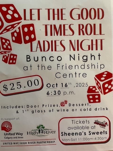 Bunco Ladies Night. A High River United Way fundraiser. Thursday, October 16, at the Seniors Friendship Centre, 504 7 St. SW, beginning at 6:30 pm. There will be a glass of wine or a non-alcoholic drink included in the $25 ticket price. Tickets are available at Sheena's Sweets on 4th Avenue downtown (hours 11-4:30 Monday to Saturday). Baskets from local businesses will be raffled off and prizes for Bunco will be given out. Join us for an evening of fun and laughter.