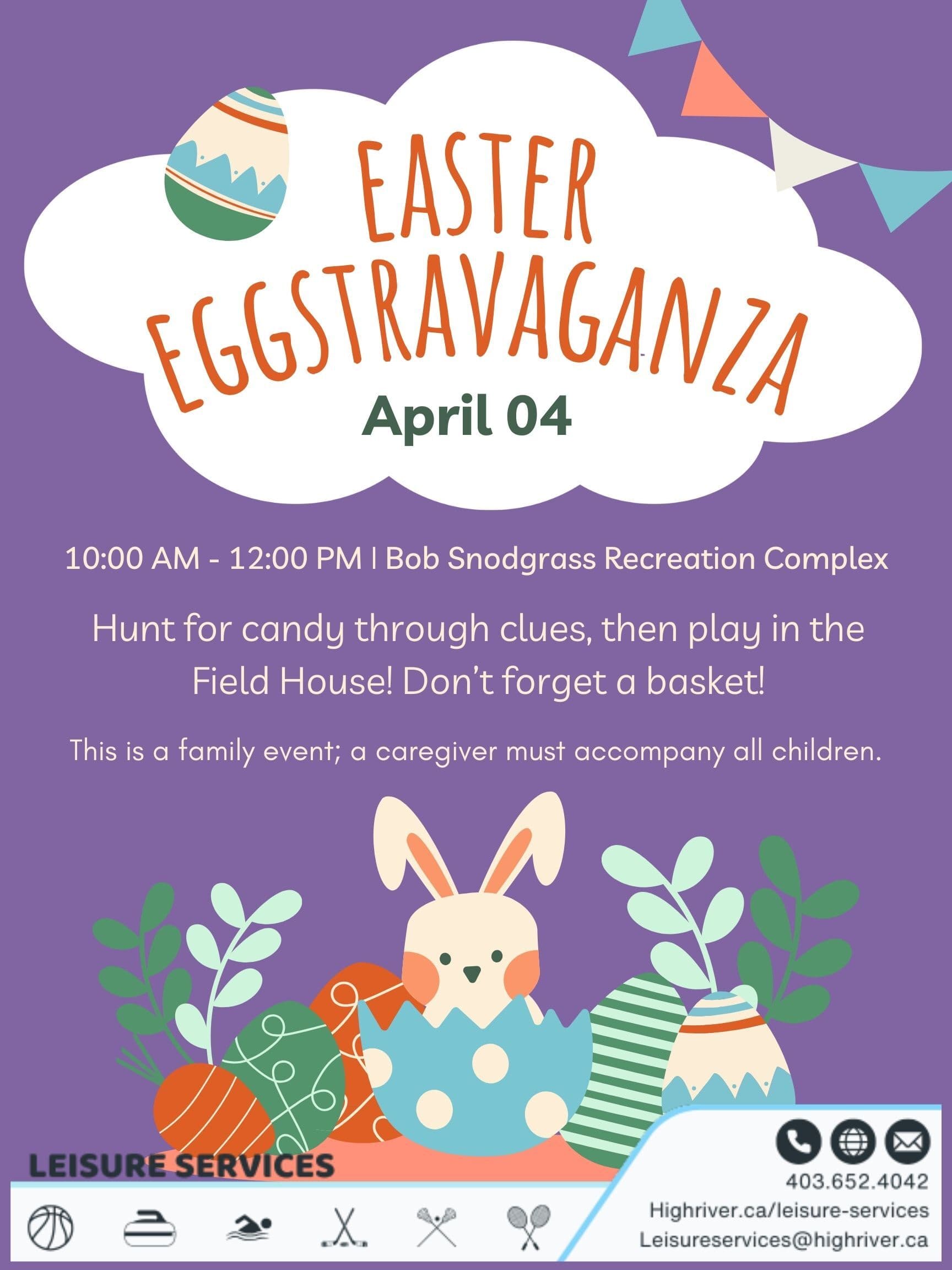 Bring the whole family for an exciting Easter adventure! Explore around the Bob Snodgrass Recreation Complex, following clues and hints to fill your Easter candy basket. After the hunt, head into the Cargill Field House to enjoy family-friendly activities and fun. This is a family event; a caregiver must accompany all children.