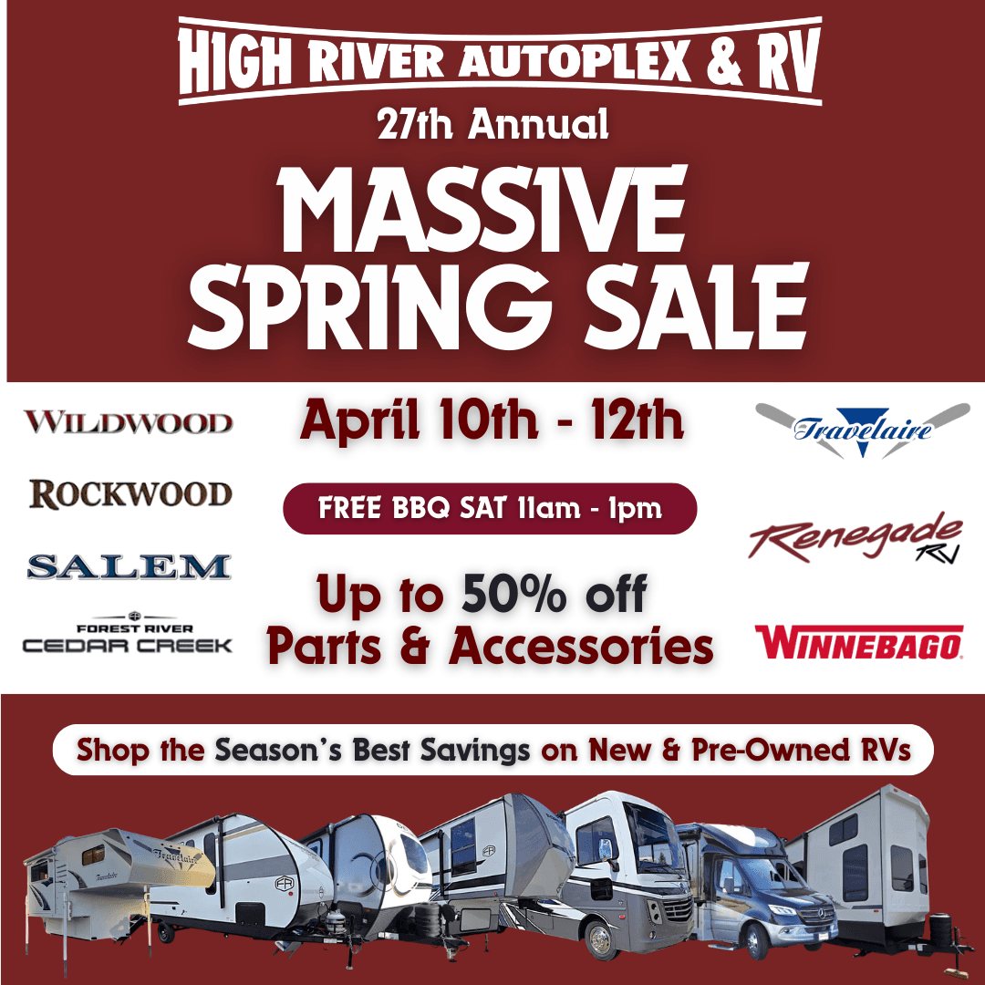 For 27 years, customers have patiently waited for High River's Massive Spring Sale in order to secure the BEST deals of the year. Join us Friday, April 10th, to Sunday, April 12th, 2026, for the most massive discounts on RVs, Parts & Accessories, and Service Specials!
