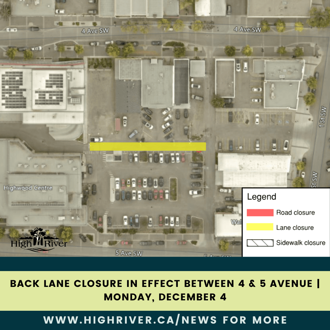 HIGH RIVER – A back lane closure is scheduled between 4 Avenue SW and 5 Avenue SW on Monday, December 4, as crews work to repair asphalt.