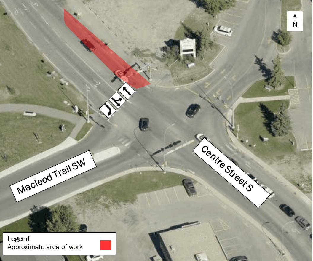The left turn lane for southbound traffic, leading into the Sobeys parking lot, will be shifted to a northbound lane. Additionally, Centre Street's existing southbound turn-only lane will temporarily serve as a combined straight and left-turn lane. These adjustments will not impact pedestrian traffic.