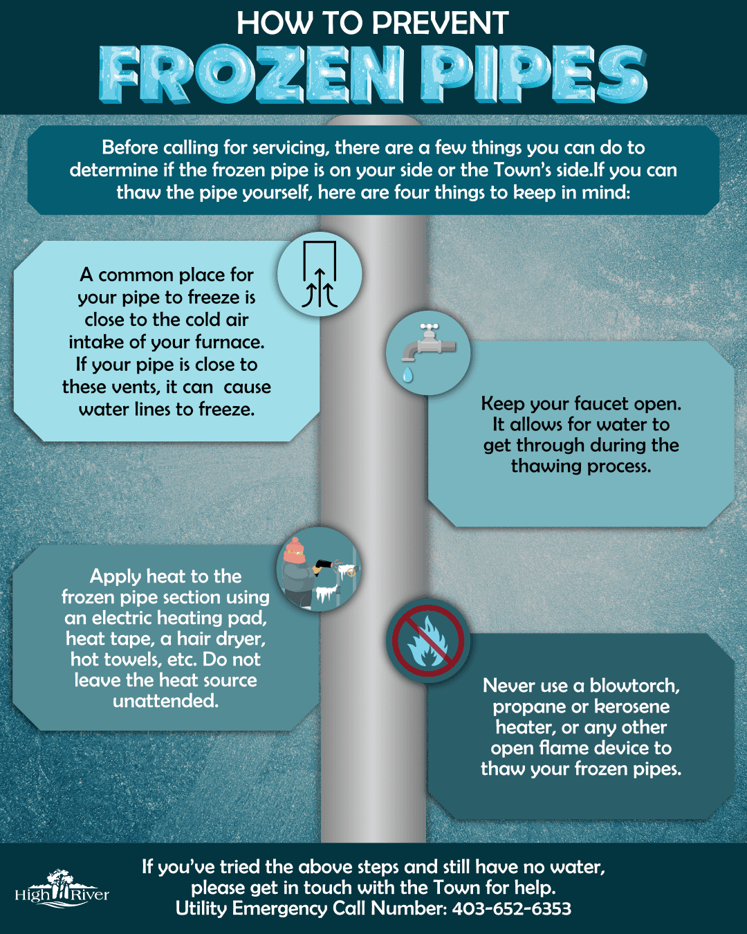 HIGH RIVER – In extreme cold weather there is often an increase in service calls for frozen water lines. A frozen water service is an inconvenience that could be costly. If the frozen pipe is on the homeowner’s property tips and steps to follow. If you suspect the frozen pipe is beyond your property line or none of the steps below work, please call the Town’s Utility Emergency Call Number: 403-652-6353