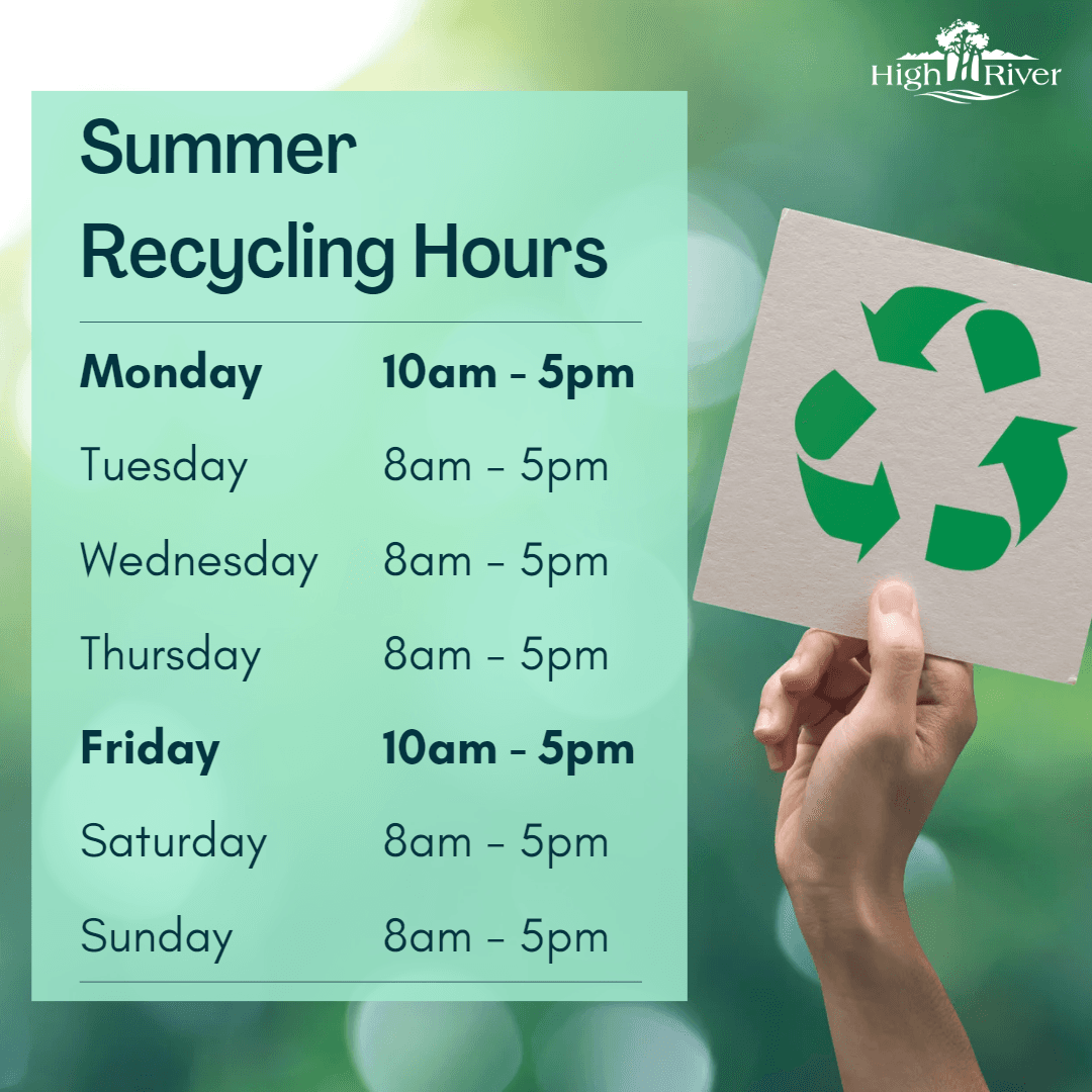 HIGH RIVER – Starting Monday, July 17, the Town of High River Recycling Centre will adjust its summer operating hours, opening at 10 am on Mondays and Fridays and closing at 5 pm as usual.
