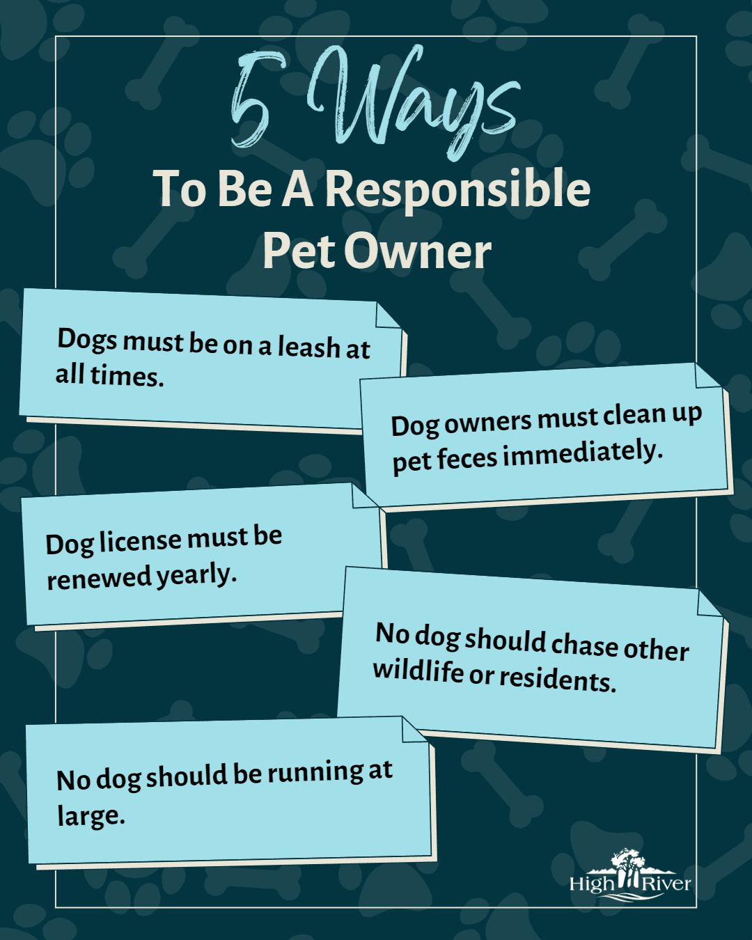 For more information on the Animal Bylaw, please visit highriver.ca/bylaws or call our General Inquiries and Administration line at 403-603-3644.