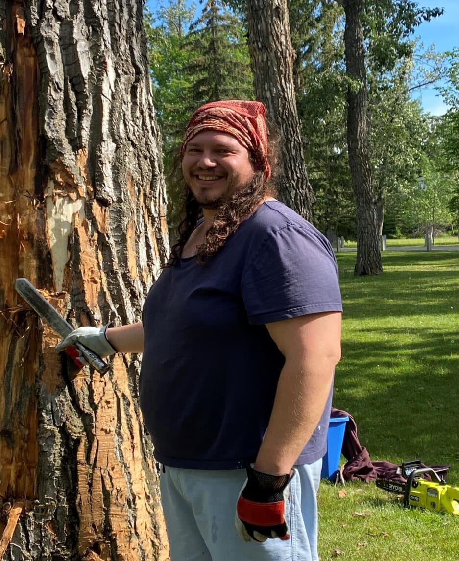 Two trees will be carved. The first, already completed, features depictions of local Indigenous symbols and cultural elements—pictographs, tipis, creation stories, buffalo jumps, porcupine hills, mountains, Highwood/Little Bow Rivers, Okotoks erratic and the Medicine Tree—arranged in ascending circles to the top.