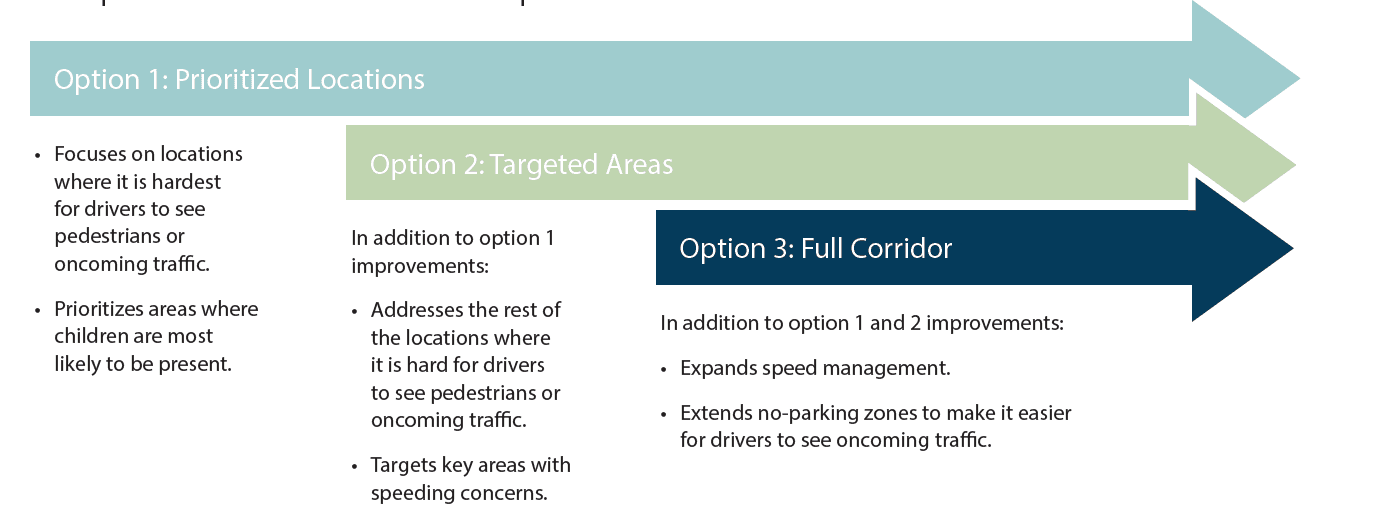 Many considerations need to be accounted for when developing the design options and finalizing recommendations for a corridor study. Community feedback, in addition to Town policies and plans, cost, best practices, and technical requirements, was used to inform the proposed design options and will be used by the Town to inform the final recommendations.
