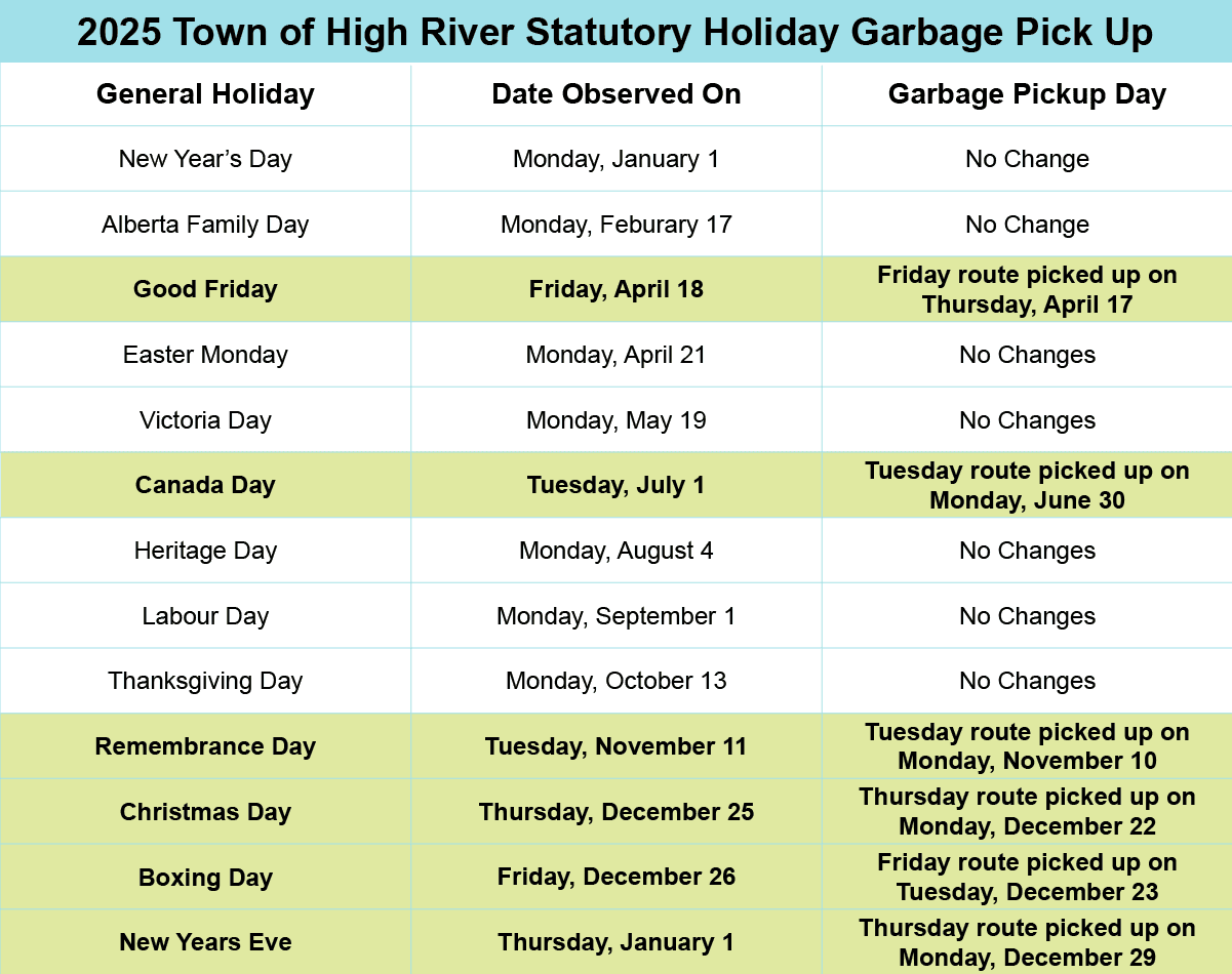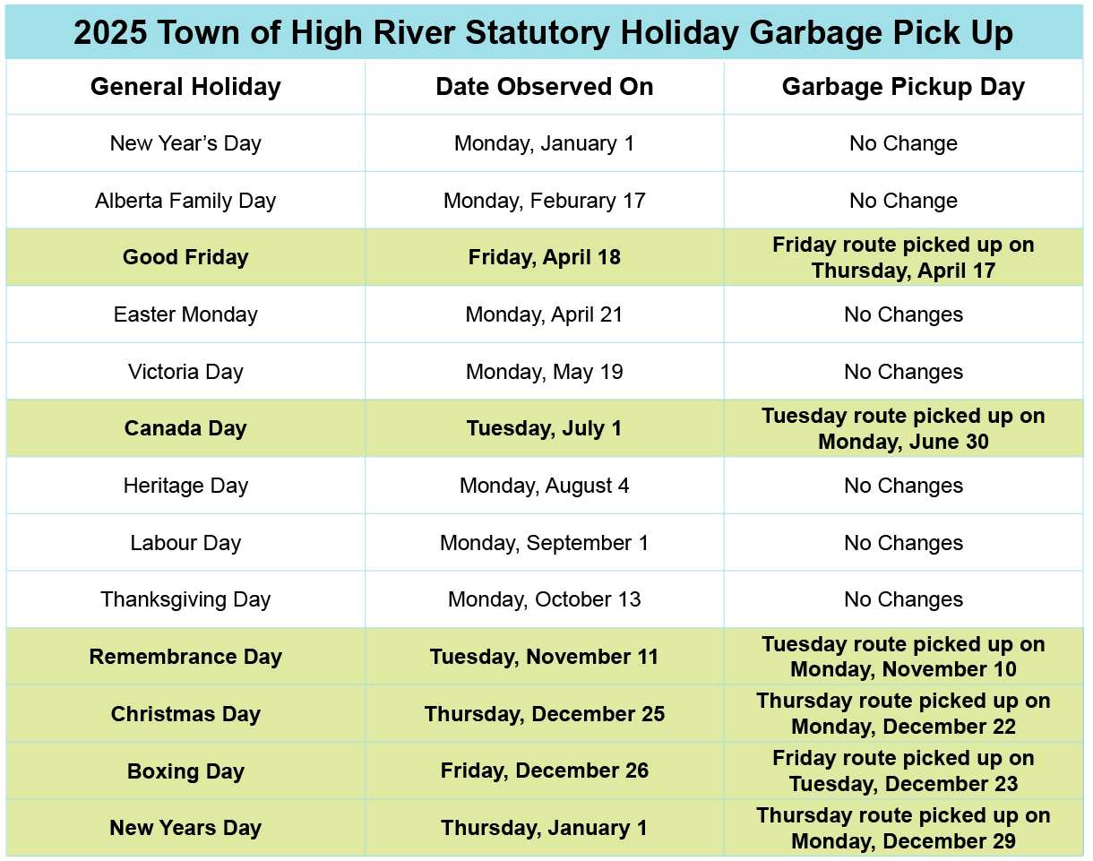 The Town of High River provides weekly automated garbage collection services to over 5,000 single-family homes and residences. Visit our Garbage Collection Map to find out when your garbage will be picked up.